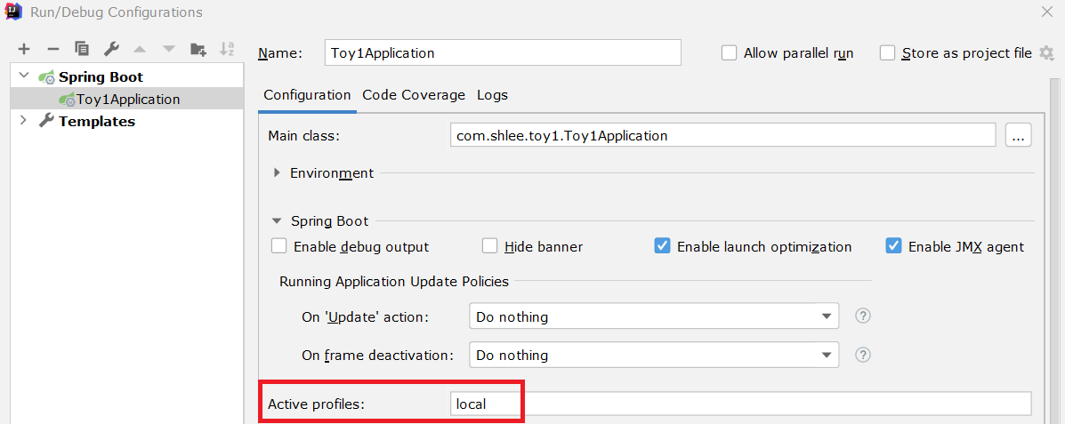 해당하는 active profiles가 무엇인지 설정한 뒤 실행하였다.